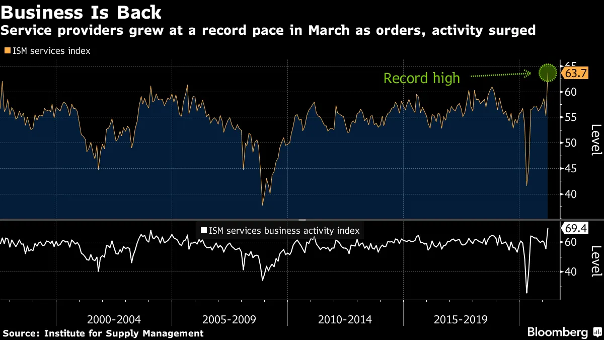 先週発表された3月のISM非製造業景況指数は63.7と予想の58.5を大きく上回り、統計開始以来最高を記録。米国経済はコロナ関連の制限の緩和でペントアップディマンド(繰延需要)が解き放たれ、予想を上回るブームを迎えている感じです。