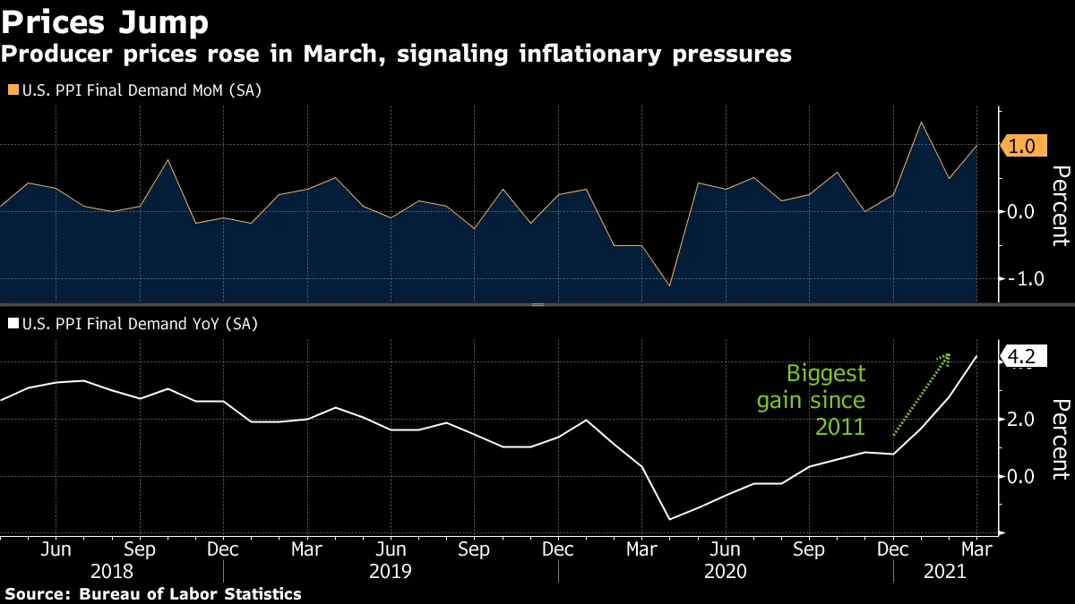 実際、先週発表された米国3月の生産者物価指数(PPI)は前年同月比で+4.2%と2011年以来の大幅な伸びとなりました。食品・エネルギーを除くコアも+3.1%と2%を大幅に上回っています。昨年のパンデミック初期のインフレ低下を基にしたベース効果があったとはいえ、インフレ懸念が高まっていることは確かです。